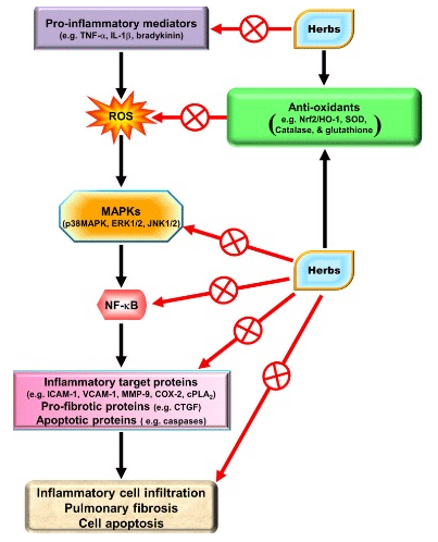 Several pro-inflammatory factors and proteins have been characterized that are involved in the pathogenesis of inflammatory diseases, including acute respiratory distress syndrome, chronic obstructive pulmonary disease, and asthma, induced by oxidative stress, cytokines, bacterial toxins, and viruses. Reactive oxygen species (ROS) act as secondary messengers and are products of normal cellular metabolism. Under physiological conditions, ROS protect cells against oxidative stress through the maintenance of cellular redox homeostasis, which is important for proliferation, viability, cell activation, and organ function. However, overproduction of ROS is most frequently due to excessive stimulation of either the mitochondrial electron transport chain and xanthine oxidase or reduced nicotinamide adenine dinucleotide phosphate (NADPH) by pro-inflammatory cytokines, such as interleukin-1β and tumor necrosis factor α. NADPH oxidase activation and ROS overproduction could further induce numerous inflammatory target proteins that are potentially mediated via Nox/ROS-related transcription factors triggered by various intracellular signaling pathways. Thus, oxidative stress is considered important in pulmonary inflammatory processes. Previous studies have demonstrated that redox signals can induce pulmonary inflammatory diseases. Thus, therapeutic strategies directly targeting oxidative stress may be effective for pulmonary inflammatory diseases. Therefore, drugs with anti-inflammatory and anti-oxidative properties may be beneficial to these diseases. Recent studies have suggested that traditional Chinese medicines, statins, and peroxisome proliferation-activated receptor agonists could modulate inflammation-related signaling processes and may be beneficial for pulmonary inflammatory diseases. In particular, several herbal medicines have attracted attention for the management of pulmonary inflammatory diseases. Therefore, we reviewed the pharmacological effects of these drugs to dissect how they induce host defense mechanisms against oxidative injury to combat pulmonary inflammation. Moreover, the cytotoxicity of oxidative stress and apoptotic cell death can be protected via the induction of HO-1 by these drugs. The main objective of this review is to focus on Chinese herbs and old drugs to develop anti-inflammatory drugs able to induce HO-1 expression for the management of pulmonary inflammatory diseases.